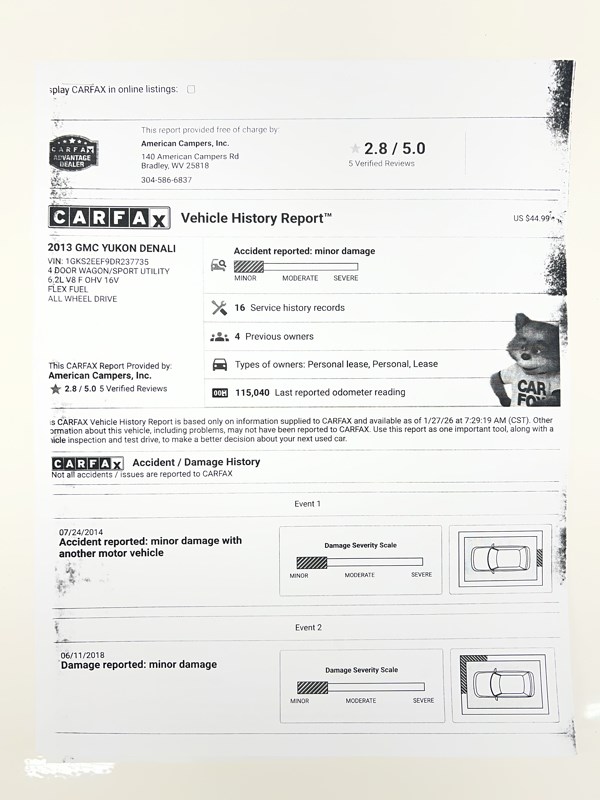 Discover the epitome of comfort and reliability with our 2013 GMC Yukon DENALI, now available at American Campers for just $14,900. This sophisticated SUV comes in an elegant black hue that exudes a sense of luxury and style, perfect for making a statement on the road. With 115,040 miles under its belt, this Yukon DENALI is powered by a robust 6.2L 8-cylinder engine that delivers a smooth and responsive driving experience. Paired with a 6-speed automatic transmission, it ensures a ride that's as effortless as it is enjoyable. Safety and convenience are paramount in this vehicle, as demonstrated by its suite of options. Active belts and dual airbags, including front head and sides, alongside an automatic passenger sensor for the airbag, ensure peace of mind for you and your passengers. Anti-lock brakes provide additional control, while daytime running lights enhance visibility at all hours. Comfort is not compromised, with air conditioning and power features, including brakes, steering, and windows, all contributing to a serene driving environment. The AM/FM CD/MP3 stereo system offers entertainment for all your journeys, and the tilt steering wheel allows for an optimal driving position. The Yukon DENALI also comes equipped with a sentry key and keyless entry, adding an extra layer of security and convenience to your vehicle access. To learn more about this exceptional SUV or to schedule a test drive, reach out to us at American Campers. You can contact our team at 304-877-2621, where our friendly staff will be more than happy to assist you. Don't miss the chance to own a vehicle that blends luxury, performance, and practicality - all in one impressive package.