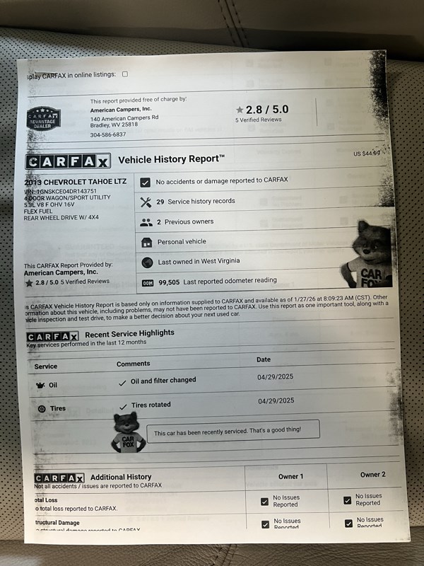 Discover the freedom of the open road with the 2013 Chevrolet Tahoe K1500 LTZ, now available at American Campers. This luxurious Pearl White SUV combines power with comfort in a package that's ideal for family adventures or cruising through town with style. Under the hood, you'll find a robust 5.3L 8-cylinder engine paired with a smooth 6-speed automatic transmission, ready to take you wherever the journey leads. With 99,505 miles on the odometer, this well-maintained Tahoe promises reliability and performance. The LTZ trim offers a host of premium options designed for your safety and convenience. Active belts and an automatic passenger sensor for the airbag enhance occupant safety, while anti-lock brakes ensure superior stopping power. Dual airbags at the front, head, and sides, along with daytime running lights, add layers of protection for all your travels. Inside, the air conditioning keeps you cool during those warm summer trips, and the AM/FM CD/MP3 stereo ensures your playlist is always on cue. Power features like brakes, steering, and windows deliver a driving experience that's both effortless and enjoyable. The Tahoe's utility is matched by its convenience features, including a sentry key and keyless entry, making access to your vehicle seamless. And, with a tilt steering wheel, you can adjust your driving position for maximum comfort on those long drives. Come see this gem for yourself at American Campers and experience the blend of power, luxury, and safety this Chevrolet Tahoe offers. To schedule a test drive or learn more, give us a call at 304-877-2621. Don't miss the opportunity to make this Tahoe your trusted companion for all of life's journeys.