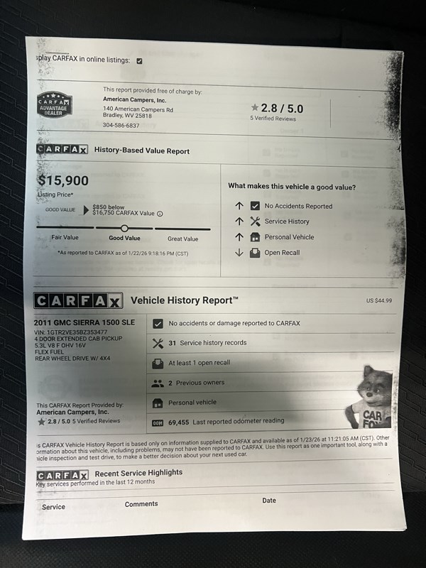 Welcome to American Campers, where we specialize in vehicles that complement your adventurous lifestyle! Today, we are excited to present to you a rugged and reliable truck that's ready for both work and play. Introducing the 2011 GMC Sierra K1500 SLE, dressed in a striking shade of blue that's sure to turn heads whether you're cruising downtown or navigating backcountry trails. This robust pickup has been meticulously maintained with only 69,455 miles on the odometer, a testament to the care it has received over the years. Under the hood, you'll find a powerful 5.3L 8-cylinder engine paired with a smooth 4-speed automatic transmission that delivers an exceptional balance of performance and efficiency. The Sierra K1500 SLE is outfitted with an array of features designed for your safety and comfort. Active belts and an automatic passenger sensor ensure the passenger airbag is deployed when necessary, while the anti-lock brakes keep you in control during unexpected situations. For added visibility, this truck is equipped with daytime running lights and dual airbags both in the front and sides for enhanced protection. Comfort is not overlooked as this Sierra boasts air conditioning for those hot days and a tilt steering wheel to adjust to your perfect driving position. The AM/FM CD/MP3 stereo system means your favorite tunes are always a click away, and with active keyless entry, getting on the move is both quick and secure. Let's not forget the power essentials - power brakes, power steering, and power windows - that make every drive a breeze. This 2011 GMC Sierra is more than just a means of transportation; it's a versatile companion ready to tackle your daily demands. Don't hesitate to give us a call at 304-877-2621 and schedule a test drive. Our team at American Campers is eager to assist you in finding the perfect vehicle for your next adventure!