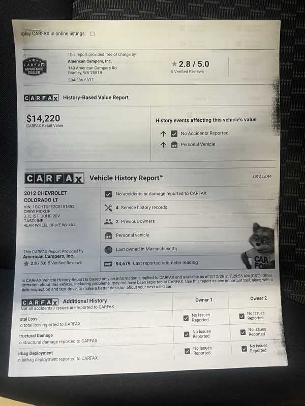 Discover the 2012 Chevrolet Colorado LT, a vibrant red truck designed to complement your adventurous spirit. With 94,679 miles on the odometer, this robust vehicle is equipped with a 3.7L 5-cylinder engine paired with a smooth 4-speed automatic transmission, delivering a perfect blend of power and efficiency for all your travels. Safety is a top priority in this Colorado LT, which comes with active belts to secure you on the road, anti-lock brakes for optimal stopping power, and dual front and head airbags to protect you and your passengers in case of an unexpected event. The daytime running lights enhance your visibility to other drivers, while the passenger sensor ensures that the passenger air bag is deployed when needed, adding an extra layer of protection. Comfort and convenience are not compromised, as this truck boasts air conditioning to keep you cool during those hot summer trips, power steering and power brakes for a smooth driving experience, and power windows for easy operation. The tilt steering wheel adjusts to your preferred driving position, ensuring comfort throughout your journey. Entertainment is at your fingertips with the AM/FM CD/MP3 stereo system, allowing you to enjoy your favorite tunes or catch up on podcasts as you cruise down the open road. Plus, the added peace of mind of an immobilizer, keyless entry, and alarm system means you can rest easy knowing your vehicle is secure wherever you park it. Don't miss the chance to own this dependable and well-equipped 2012 Chevrolet Colorado LT. Contact American Campers at 304-877-2621 to schedule a test drive and experience all that this exceptional truck has to offer. Your next adventure awaits!