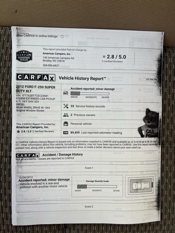 At American Campers, we're proud to offer this 2012 Ford F250 Super Duty-a truck built to handle the toughest jobs with confidence and capability. Dressed in a bold maroon finish, this heavy-duty powerhouse is ready to impress both on the road and off. Under the hood, the 6.7L 8-cylinder engine paired with a 6-speed automatic transmission delivers the strength and smooth performance you expect from a Ford Super Duty. With 135,257 miles, this F250 has proven its reliability and still has plenty of work and adventure ahead. The turbocharged engine ensures that whether you're towing, hauling, or cruising, you'll have the power you need on demand. Inside, you'll find thoughtful features designed for comfort and control. Enjoy the convenience of air conditioning, AM/FM stereo, and a tilt steering wheel that makes every drive more enjoyable. Safety comes standard with anti-lock brakes, dual rear side and rear head air bags, and a passive engine immobilizer for peace of mind. Power brakes and power steering further enhance the confident handling and stability of this rugged truck. If you've been searching for a dependable, hard-working pickup that doesn't compromise on performance, this 2012 Ford F250 Super Duty is ready to deliver. Visit American Campers today or call 304-877-2621 to learn more and take the next step toward owning this impressive truck.
