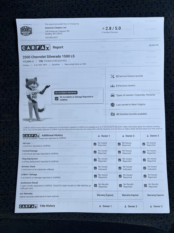 Discover rugged reliability and classic American strength with this 2000 Chevrolet Silverado K1500, now available at American Campers. Dressed in a striking blue finish, this Silverado proudly carries its legacy as one of the most dependable full-size trucks ever built. With 177,156 miles on the odometer, it's seasoned enough to prove its durability while still ready for miles of adventure ahead. Under the hood, the 5.3L 8-cylinder engine delivers the kind of power that made the Silverado a household name, paired with a smooth automatic transmission for effortless driving whether you're hauling, towing, or cruising the open road. Inside, you'll find a thoughtfully equipped cabin featuring an AM/FM stereo for your favorite road tunes, a tilt steering wheel for comfort, and the convenience of power brakes and power steering. Safety was a priority in this generation, with dual front air bags, passenger air bag deactivation, active belts, anti-lock brakes, and daytime running lights providing peace of mind wherever the journey takes you. This Silverado K1500 isn't just a truck-it's a dependable companion built to handle both work and play with confidence. Visit American Campers today or call 304-877-2621 to schedule a closer look at this classic Chevrolet Silverado. Experience firsthand why this pickup continues to be a trusted choice for those who value performance, capability, and enduring style.