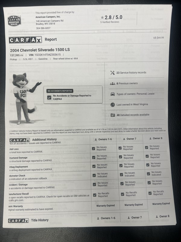 Step into dependable performance with this 2004 Chevrolet Silverado K1500, now available at American Campers. Dressed in a sleek silver birch finish, this full-size pickup blends rugged strength with everyday practicality. With 137,365 miles, it's proven its reliability while still ready for countless adventures ahead. Under the hood, the powerful 5.3L 8-cylinder engine pairs seamlessly with an automatic transmission, delivering confident acceleration and smooth handling whether you're hauling gear or cruising the highway. The Silverado's sturdy build and classic design make it a trusted companion for work, play, or weekend escapes. Inside, you'll find thoughtful features that enhance comfort and peace of mind. Enjoy the convenience of air conditioning, tilt steering wheel, power steering, and power brakes for a controlled and relaxed drive. Safety and security come standard with active belts, dual front air bags, a passenger sensor, and anti-lock brakes-ensuring protection on every trip. The AM/FM stereo keeps you connected to your favorite stations while the Pass Key system provides added security. At American Campers, we're proud to offer vehicles that embody durability and value. This Silverado K1500 stands as a true example of Chevrolet craftsmanship-dependable, versatile, and ready for the road ahead. Call American Campers today at 304-877-2621 to schedule your test drive and experience the strength and reliability of this well-maintained Silverado K1500 for yourself. 8 inch fabtech suspension lift, 3 in body lift, brand new 37x12.50x22 tires, brand new 22x12 wheels, full paint mtach including steps