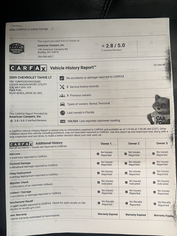 Welcome to American Campers, where we specialize in providing top-quality vehicles for all your adventures. Today, we're excited to highlight a true gem in our inventory - a 2009 Chevrolet Tahoe LT that's as ready for the road as you are. This Tahoe shines in a sleek silver hue, a testament to its sophistication and style. With 103,923 miles on the odometer, it's clear this vehicle has been cared for and is waiting to take you on your next journey. Under the hood, you'll find a robust 5.3L 8-cylinder engine that delivers the power and performance Chevrolet is known for. Whether you're navigating city streets or exploring country roads, this Tahoe has the muscle to get you there with confidence. As for features, this LT trim is packed with amenities to provide a safe, comfortable, and enjoyable experience. Active belts and anti-lock brakes ensure your security, while dual airbags in the front and sides offer additional protection for you and your passengers. The convenience of power brakes, power steering, and power windows adds to the luxurious feel of this SUV. The interior isn't lacking in entertainment or comfort either. You'll enjoy the perks of air conditioning on those warmer days, and the AM/FM CD/DVD stereo system keeps you and your passengers entertained no matter where you're headed. For ease of access, this Tahoe comes with a sentry key, keyless entry, and an alarm system to give you peace of mind. The tilt steering wheel ensures a comfortable driving position, and the turbocharger is a bonus that offers a more exhilarating driving experience. Don't miss your chance to own this versatile and well-equipped 2009 Chevrolet Tahoe LT. Give us a call at 304-877-2621 to schedule a test drive or to learn more about this fantastic vehicle. American Campers is here to help you find your perfect ride.